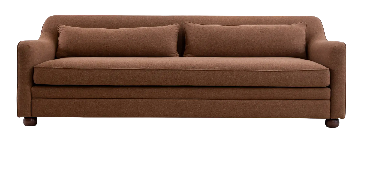 The Amira sofa offers warmth and comfort with its gracefully curved high back and subtly flared arms. Upholstered in durable polyester fabric with piping cushion details. The feather and fiber topped bench seat cushion creates luxurious repose. Generously proportioned lumbar cushions and solid wood feet complete this centerpiece.