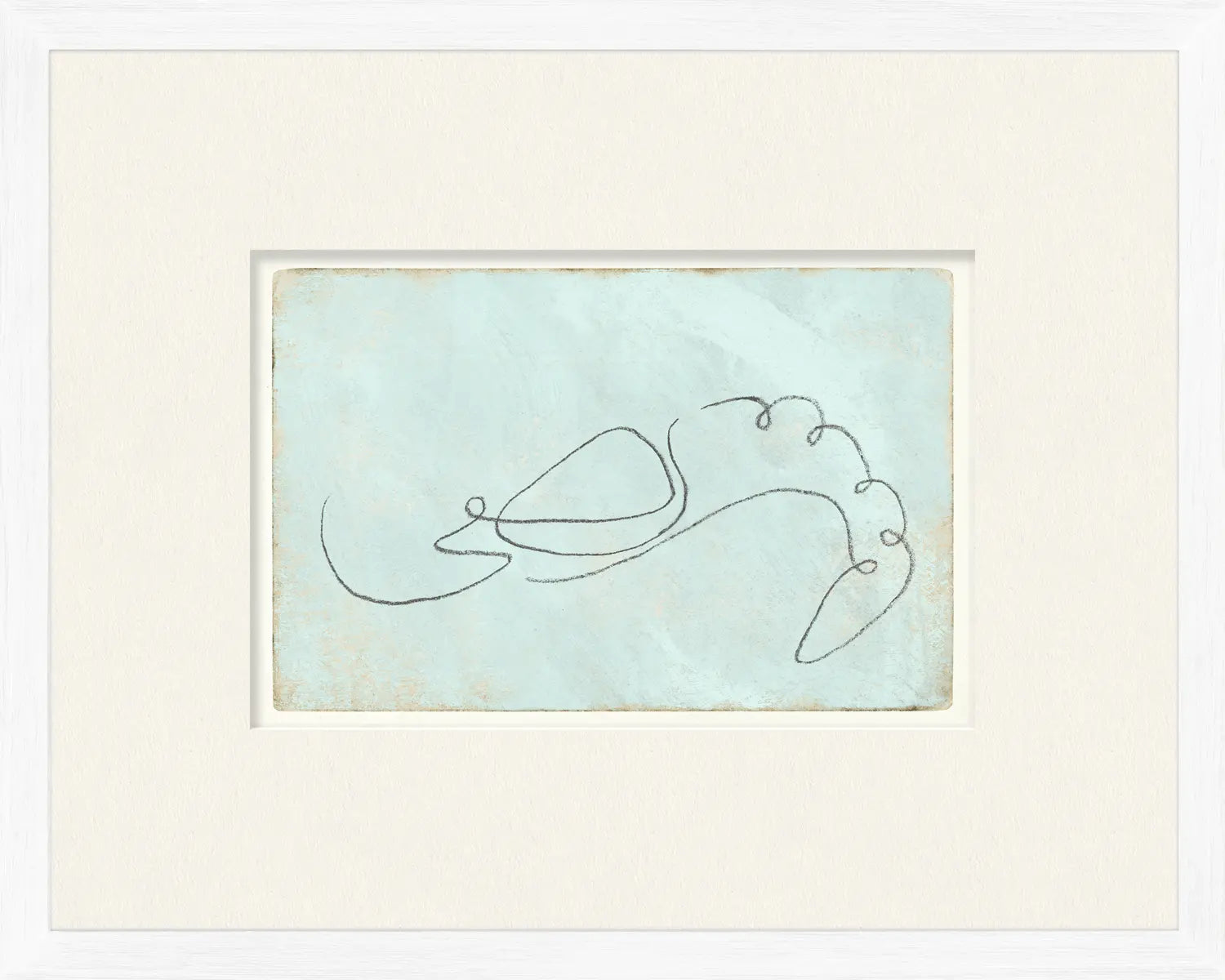 Beautifully presented with pastels of aqua, taupe & cream, these one-line drawings are created by the artist with a touch of whimsy. Beautifully matted and presented in a white washed frame, they are lovely as stand-alone pieces or in a collection.
