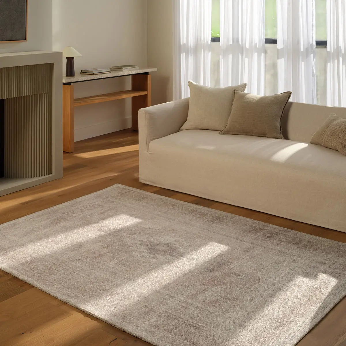The Adorn design features a traditional medallion motif, set against a warm tan and beige backdrop with subtle accents. Its vintage, distressed look adds character and charm, making it feel like a cherished heirloom from the very first step.