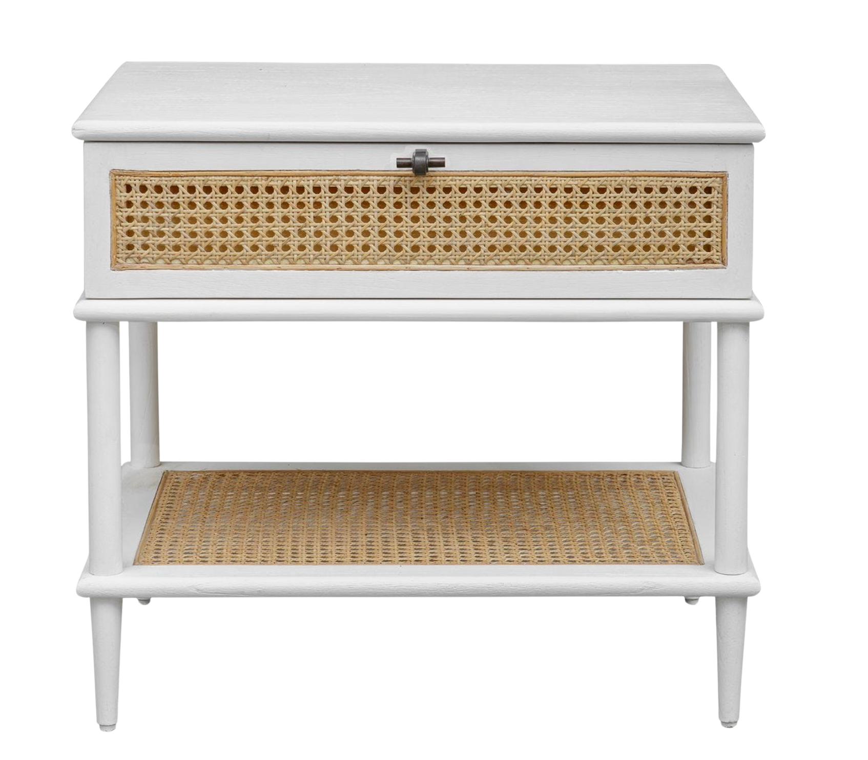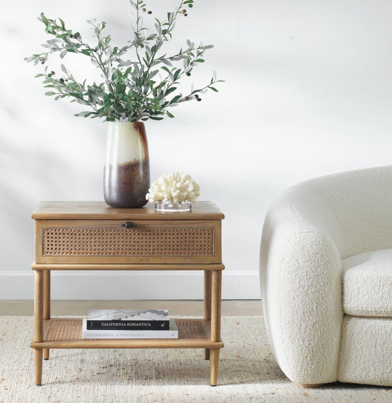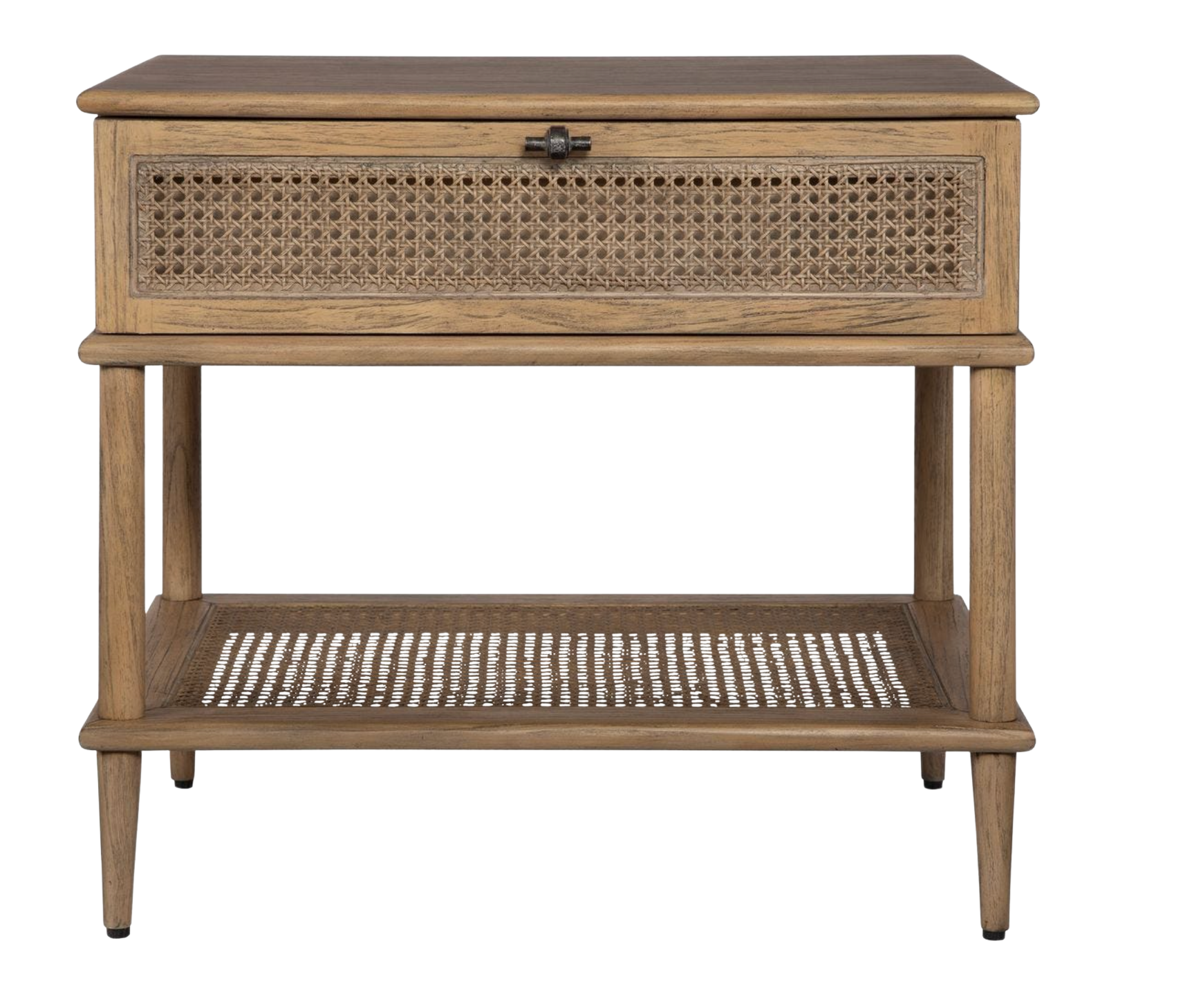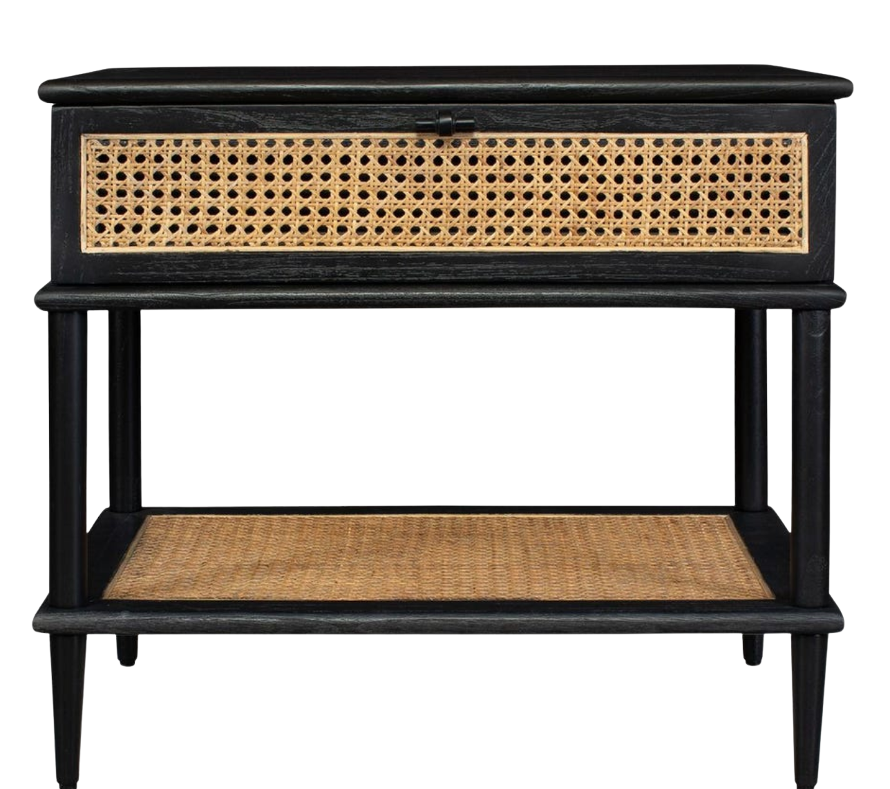 Mid century inspired with accents of natural rattan cane, this console table features mindi solids and veneers finished in a soft oak stain. The Coast table has one storage shelf with metal hardware finished in dark gunmetal.