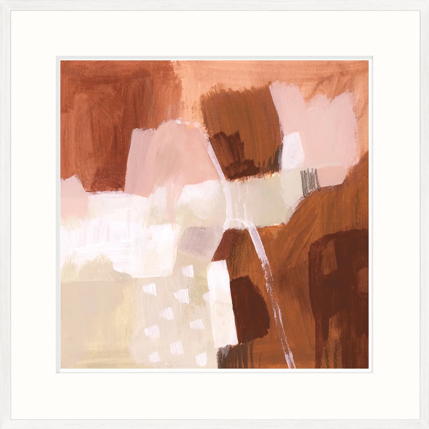Stunning abstract with shades of rich terra cotta, muted pink, and white. Beautifully presented with matte and white wood frame.