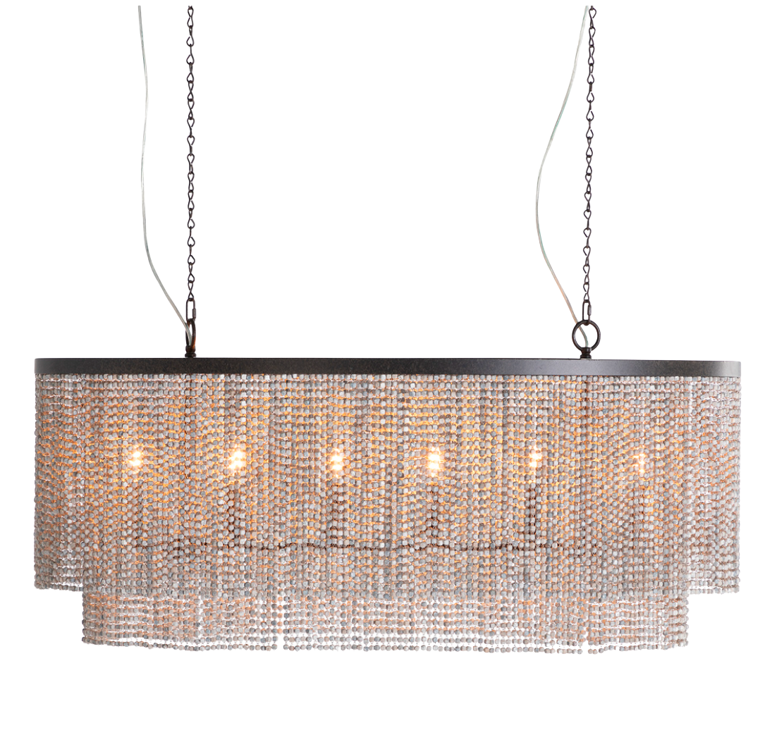 The Linear Etienne Chandelier captivates with its artful arrangement of wooden beads featuring a blend of antique white dusty slate and rust finishes. Hand painted square wooden beads in shades of antique white and dusty slate cascade in aligned layers.