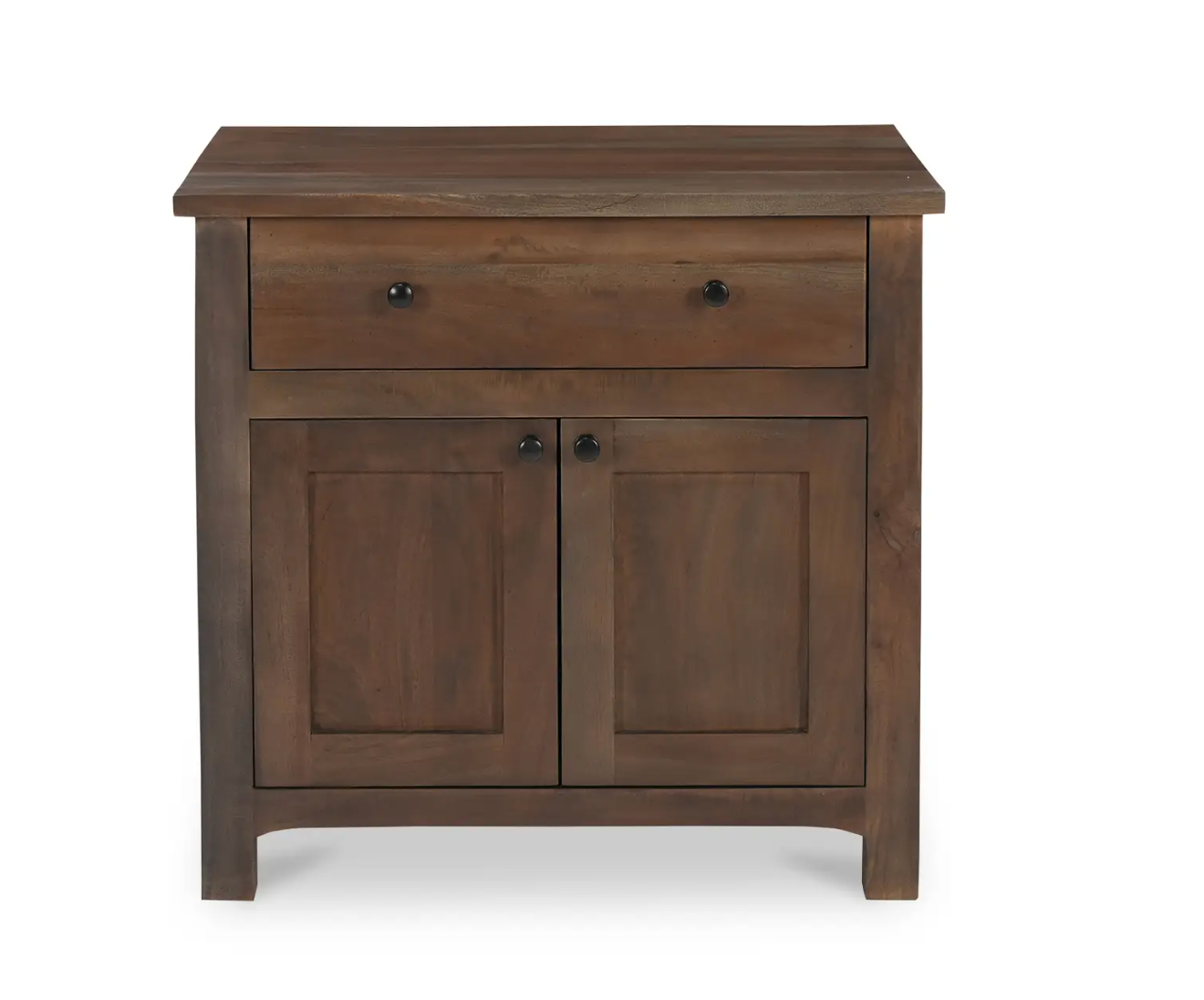 Finished in a rich dark brown, this reclaimed neem wood Gene charging nightstand offers a harmonious blend of form and function, merging modern technology with timeless elegance. Two doors reveal open shelving, while a soft-close drawer provides discreet storage. Crafted with mango wood, an integrated wireless charging top compatible with both Mac and Android devices adds a contemporary touch to this sophisticated piece.