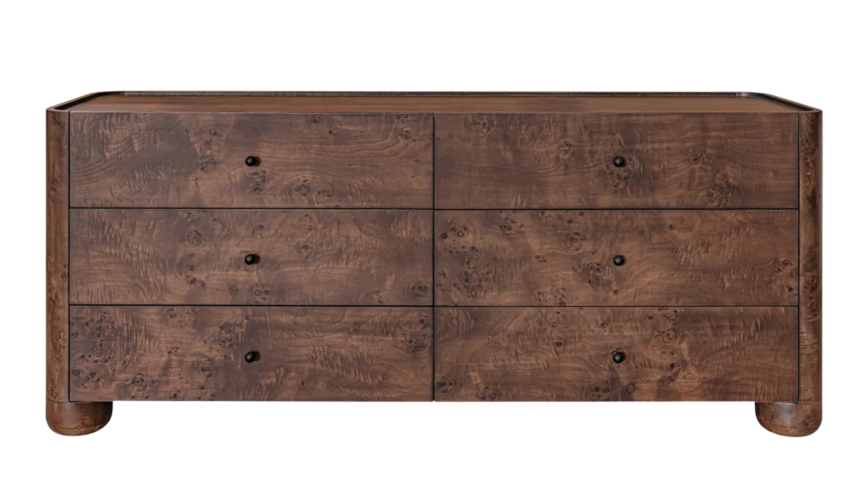 The Gibson 6 drawer dresser's fluid design seamlessly integrates the leg panel into the frame, creating a captivating visual flow. Crafted from solid oak with beautifully grained burl veneer, this piece marries durability with sophistication. Playful lip detailing and 6 soft-close drawers add unexpected charm with its timeless appeal and meticulous craftsmanship.