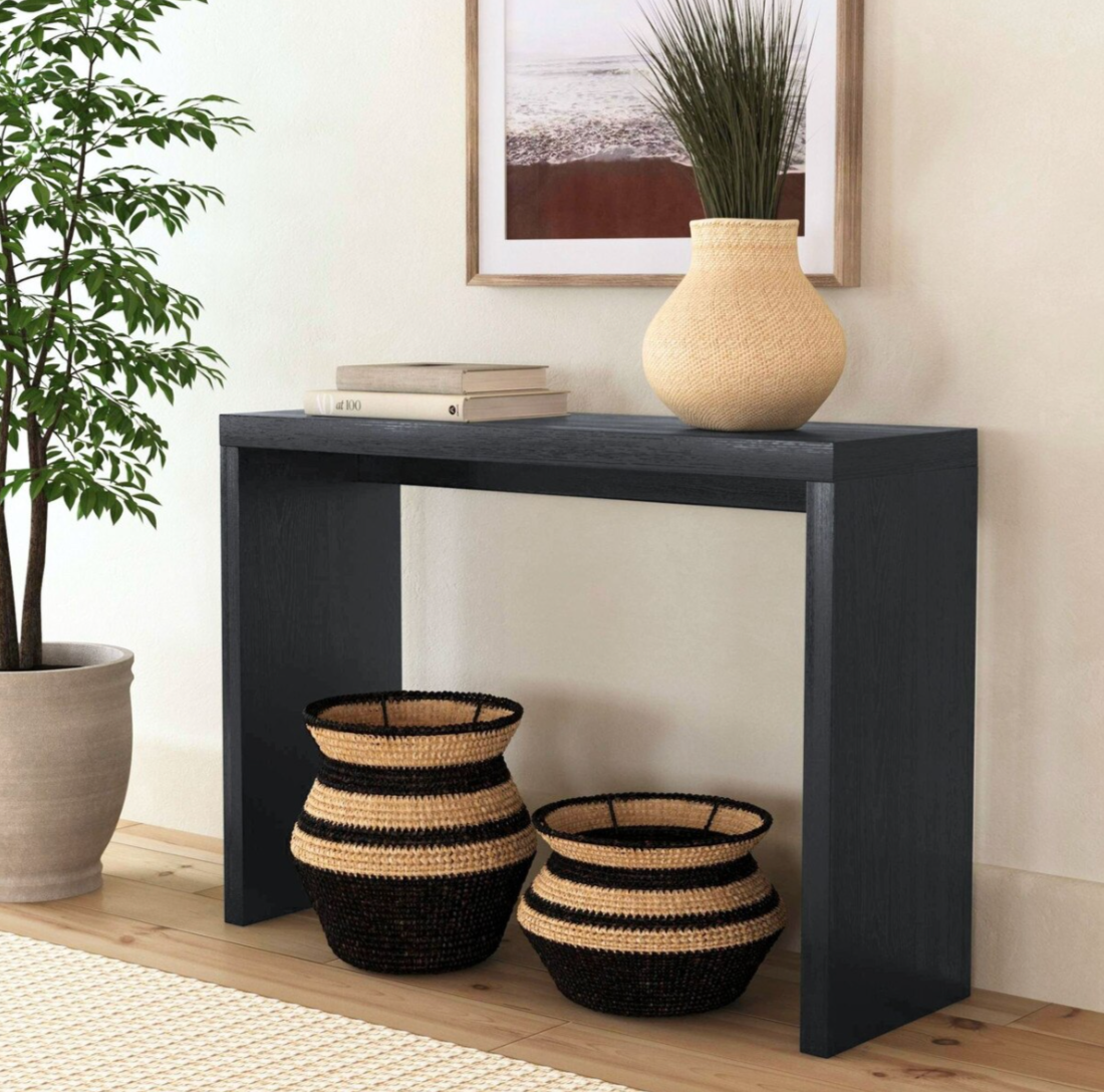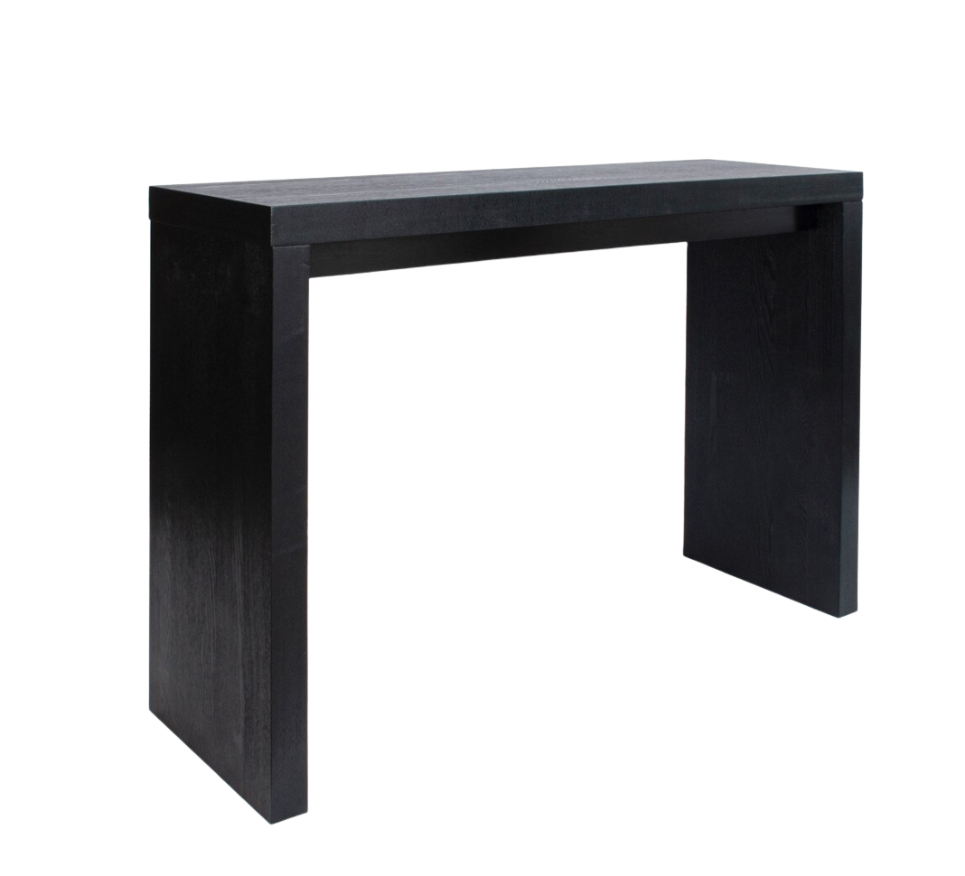 A minimalist modern console table with waterfall edge makes a one-of-a-kind contemporary statement piece for your living space. The sleek rectangular table is hand finished in timeless black or light natural wood stain. The angular, clean lines of the console's silhouette has tapered detailing making a feature of the fine craftsmanship and organic wood tones. The versatile style of this console is at home in modern, industrial and transitional living rooms, dining rooms or entryways.