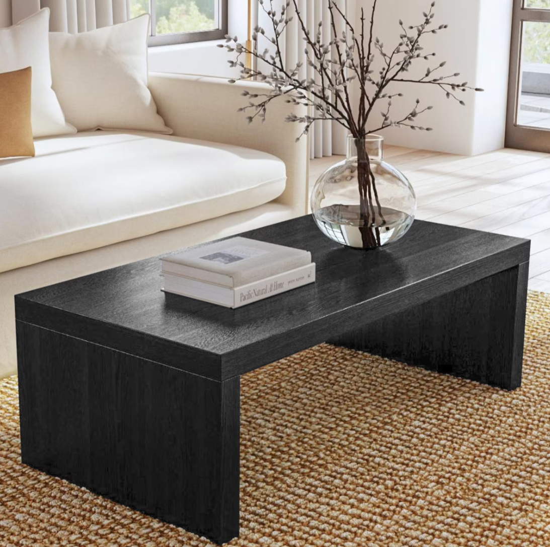 A minimalist modern coffee table with waterfall edge makes a one-of-a-kind contemporary statement piece for your living space. The sleek rectangular table is hand finished in timeless black or light natural wood stain. The angular, clean lines of the table's silhouette has tapered detailing making a feature of the fine craftsmanship and organic wood tones. This simple, refined design is at home in modern, industrial and transitional living rooms styles.