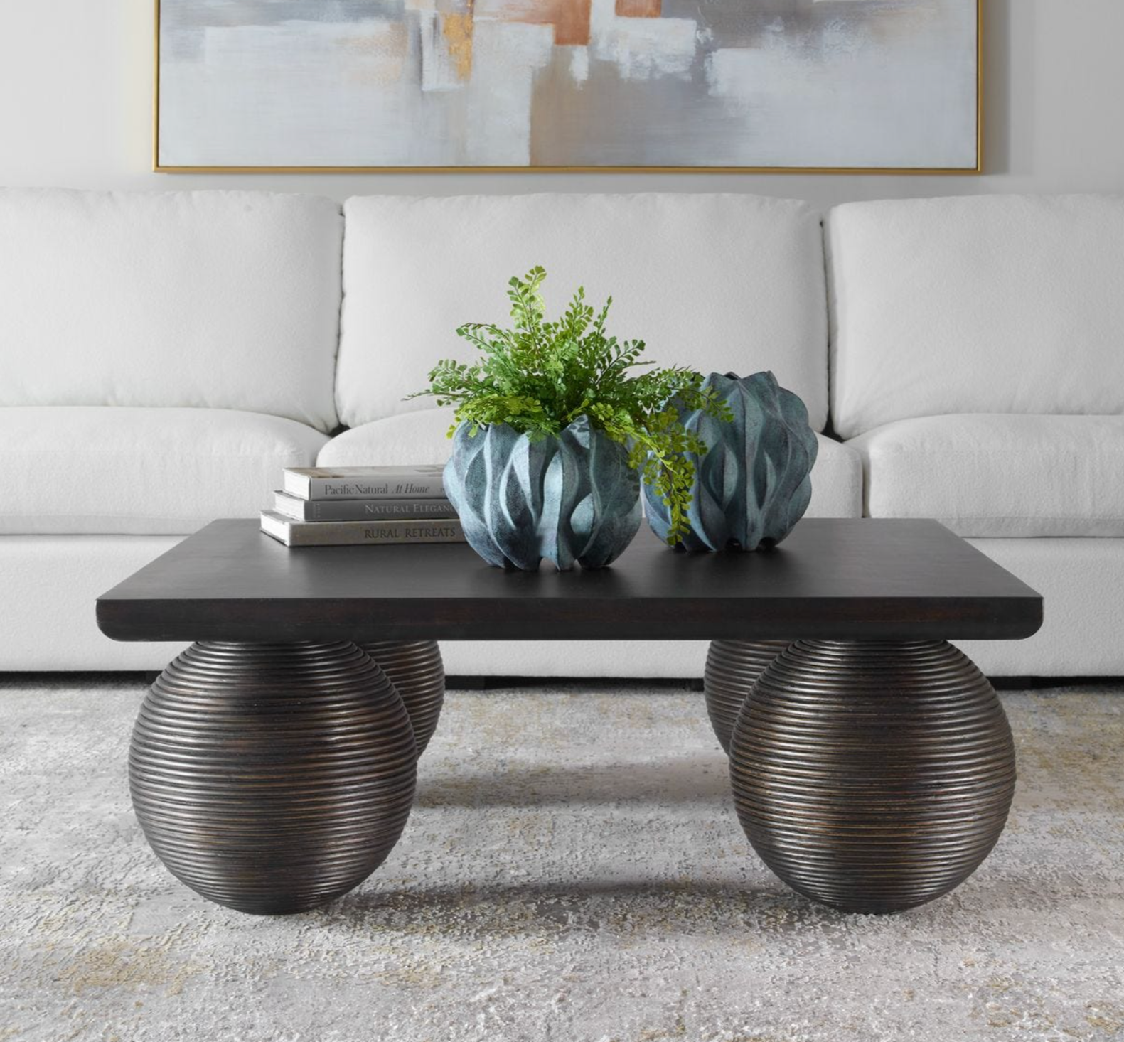 This coffee table is sure to be the focal point of any room, featuring oversized rattan-covered spheres as legs. The table is crafted from mango-wood veneer and finished in a distressed black.