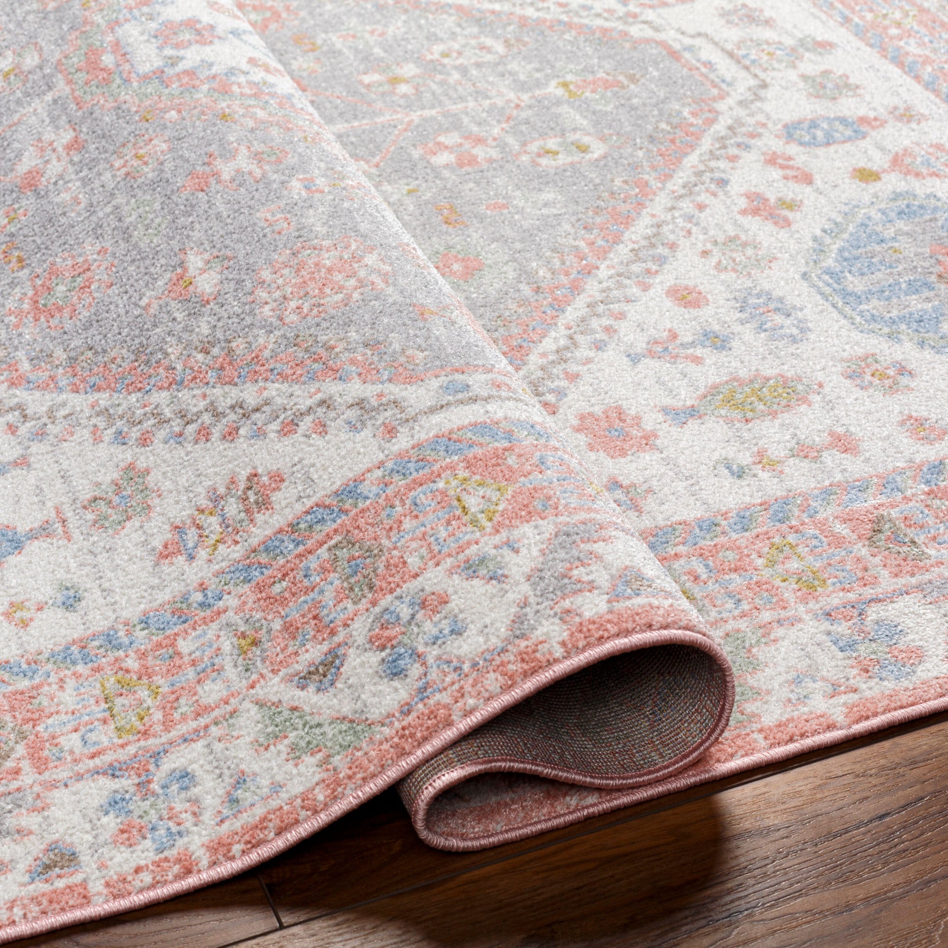 The Lavadora Runner is a playful and eye-catching piece that brings youthful energy to any space. Featuring a soft blend of blush pink, sky blue, and golden accents, this rug showcases a classic medallion pattern framed by a decorative border. Its washed effect offers a vintage feel, balanced by the rug's bold palette—ideal for hallways, kitchens, or nurseries in need of color and charm.