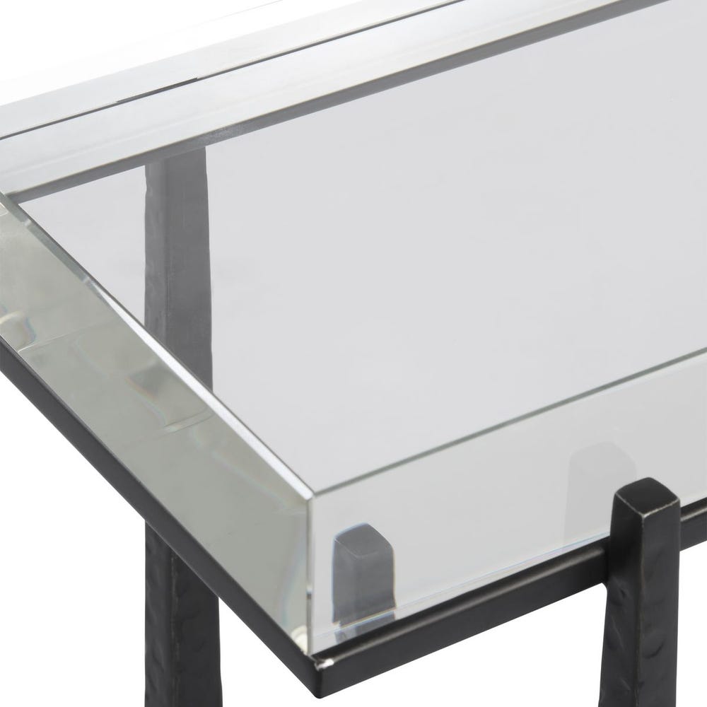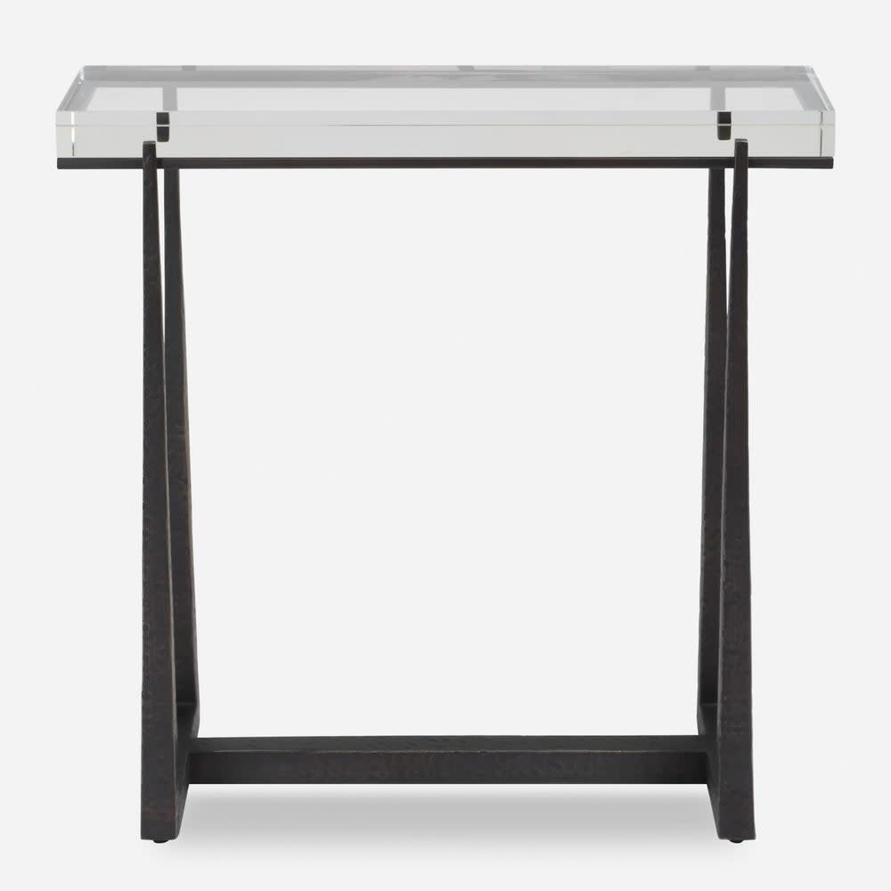 Sleek, sculptural, and strikingly modern, the Midas End Table is a study in contrast and craftsmanship. A thick, crystal-clear acrylic top appears to float above a hand-forged iron base, finished in a matte black with subtle hammering for artisanal texture. Slim yet bold, this table adds architectural interest and an airy sophistication—perfect beside a sofa, accent chair, or in pairs for a balanced look.