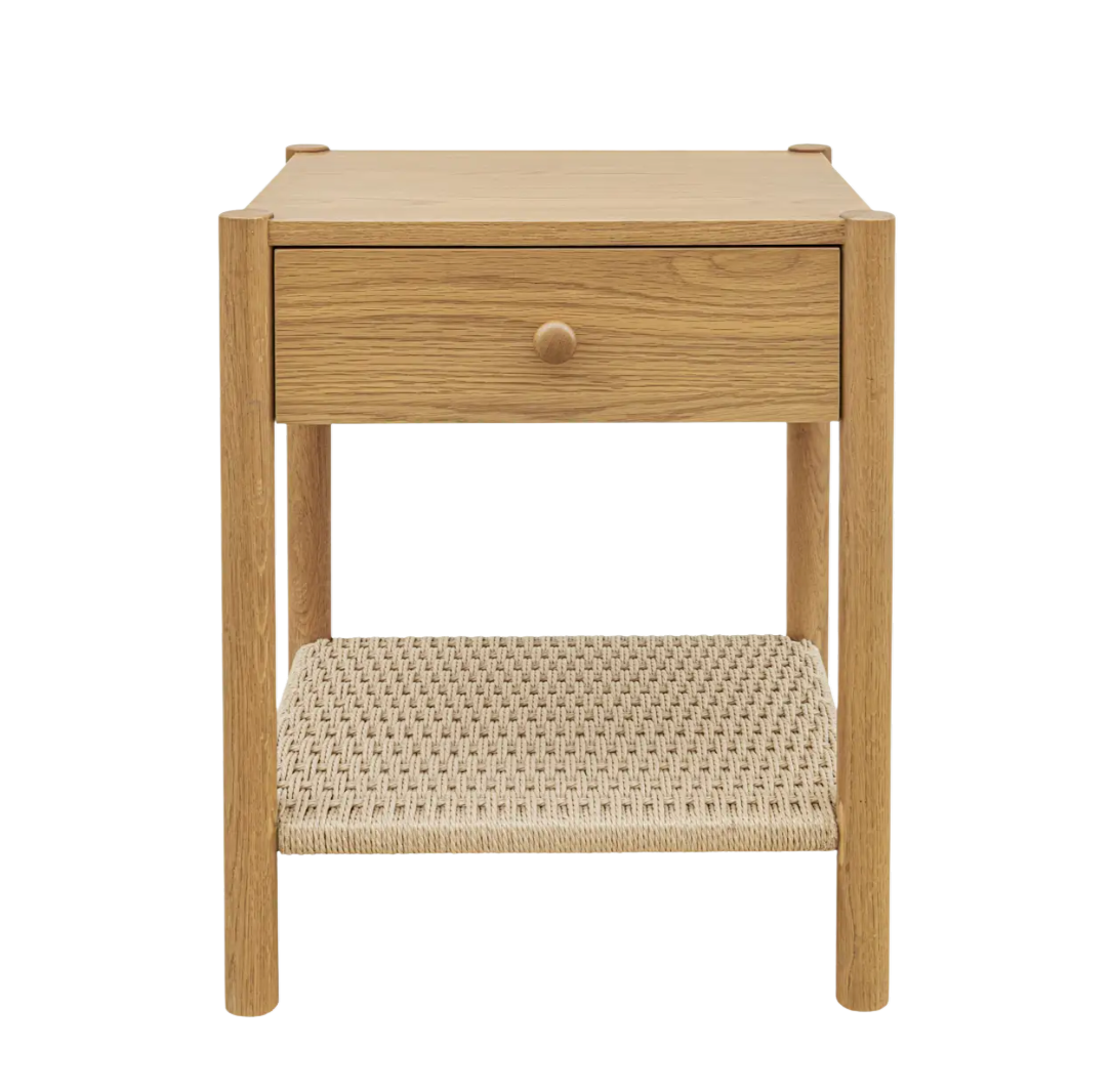 The Millie nightstand embodies understated elegance, harmoniously blending simplicity with sophistication. Artfully woven natural paper rope adorn its clean silhouette, introducing a captivating texture. A single drawer with soft-close glides and an open shelf below offer practical storage solutions. Supported by solid oak legs, this piece bridges quiet luxury with timeless appeal.