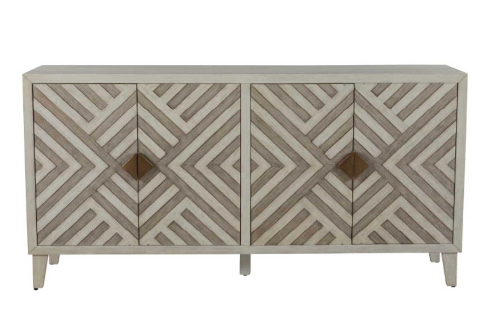 The Molena Cabinet exudes a sense of timeless geometry and textured beauty merging classic design with a modern twist. Its surface showcases a captivating pattern of intersecting lines offering a visual play of shapes that catches the eye. This piece is finished in an elegant blend of antique gray and sesame white a versatile palette that harmonizes with both contemporary and traditional interiors Ideal for those who appreciate artistry in their furniture the Molena Cabinet serves as both a functional storage solution and a statement piece.