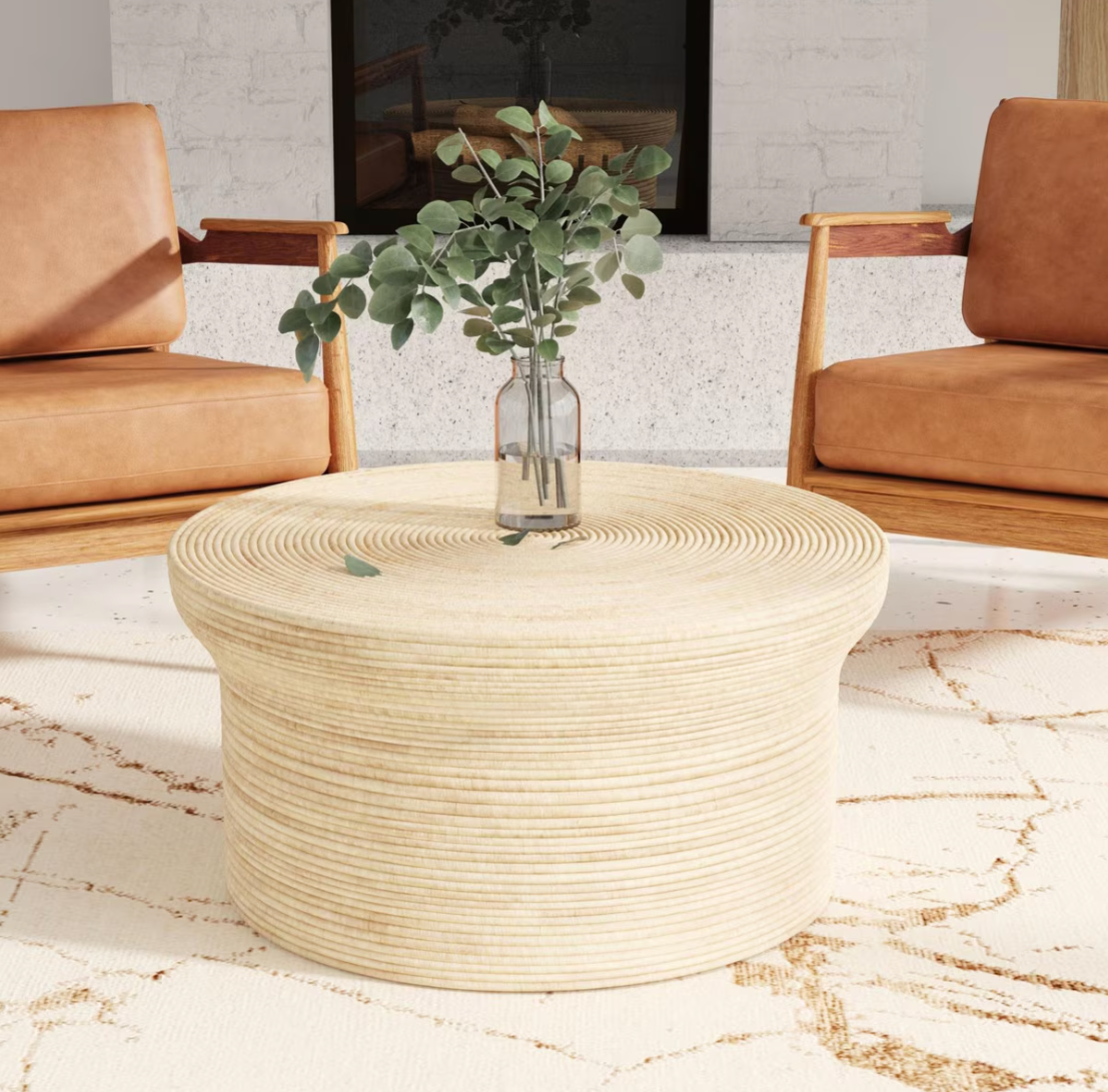 An organic textured round coffee table is crafted from rattan wrapped with natural, sustainable raffia. The modern curved line of the flared top adds an elevated update to its relaxed, coastal vibes. Due to the nature of materials and handcrafted processes, some natural variation in color and texture is to be expected, adding to the unique beauty of each piece.