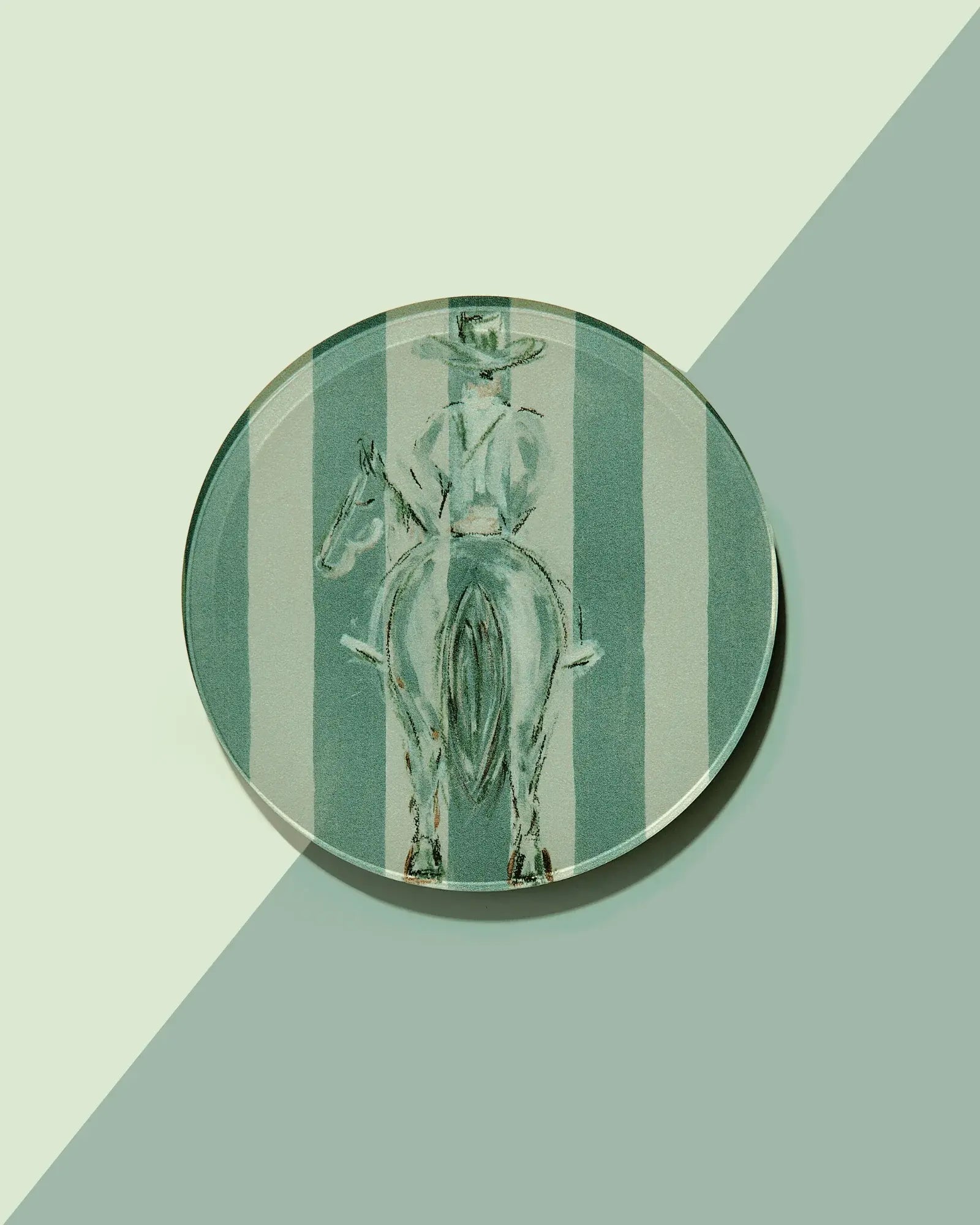 Bring a bit of bold Western charm to your tabletop with the Trailblazer Coaster. Featuring a striking hand-painted cowboy motif from behind—complete with horse and hat—this round coaster adds a touch of artistic Americana to any setting. The soft sage-toned stripes create a sophisticated contrast against the rustic illustration, making it a standout piece on its own or part of a collected set.