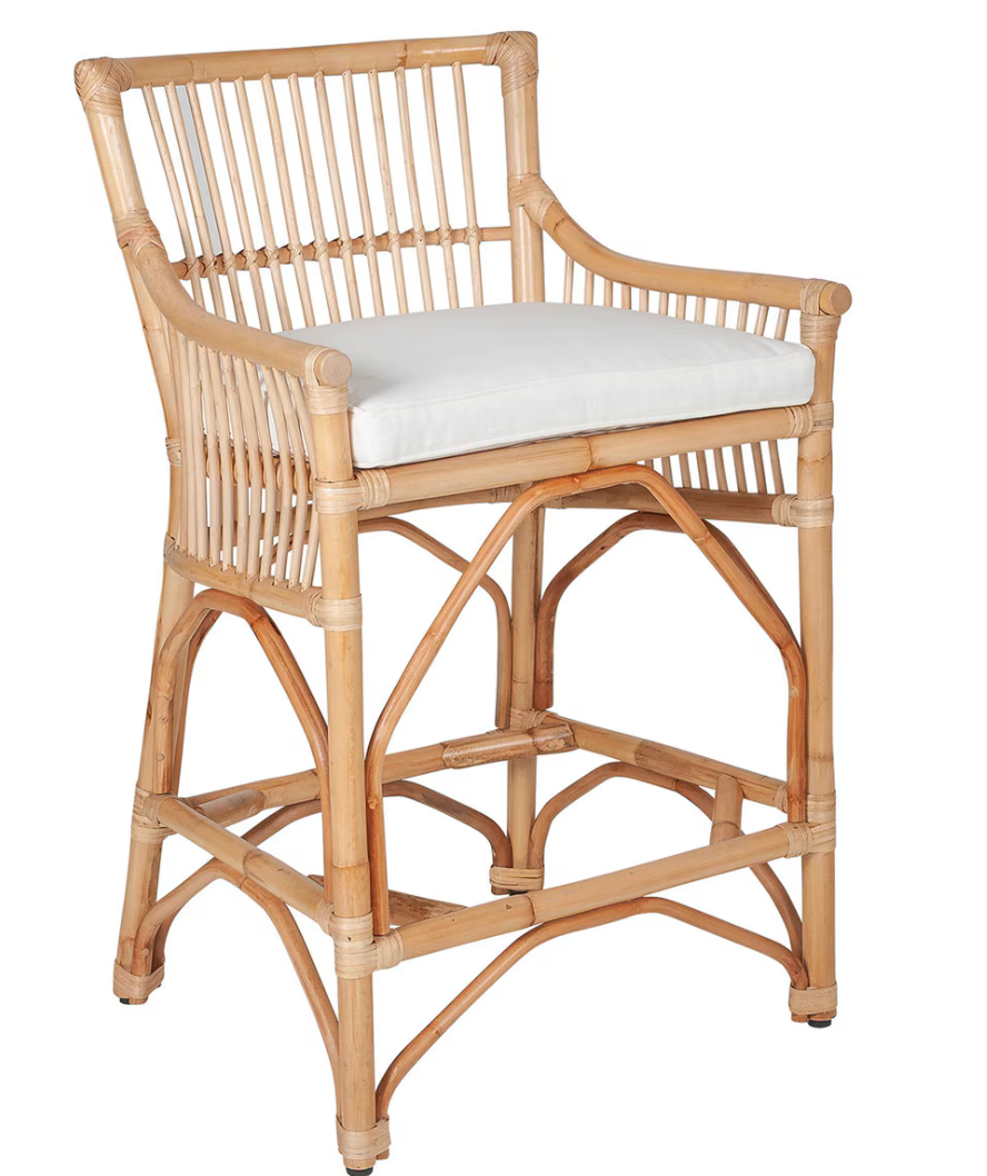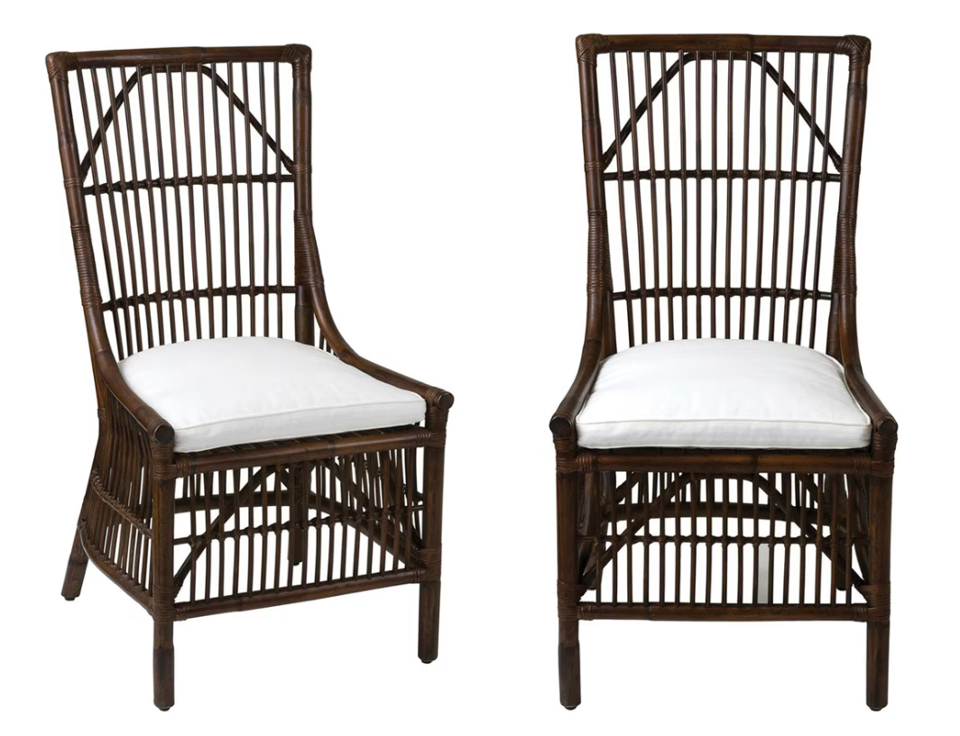 Lightweight yet full of character, the Winston Rattan Dining Chair brings relaxed sophistication to any dining space. Handcrafted from natural rattan in a deep espresso finish, its airy vertical weave and high back create an effortlessly elegant silhouette. The plush white cushion adds comfort without sacrificing style. Also available as a counter stool, barstool, or in alternate finishes to suit your space—from coastal to modern boho.
